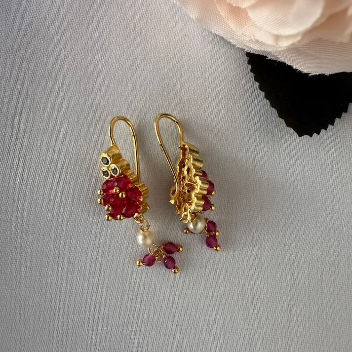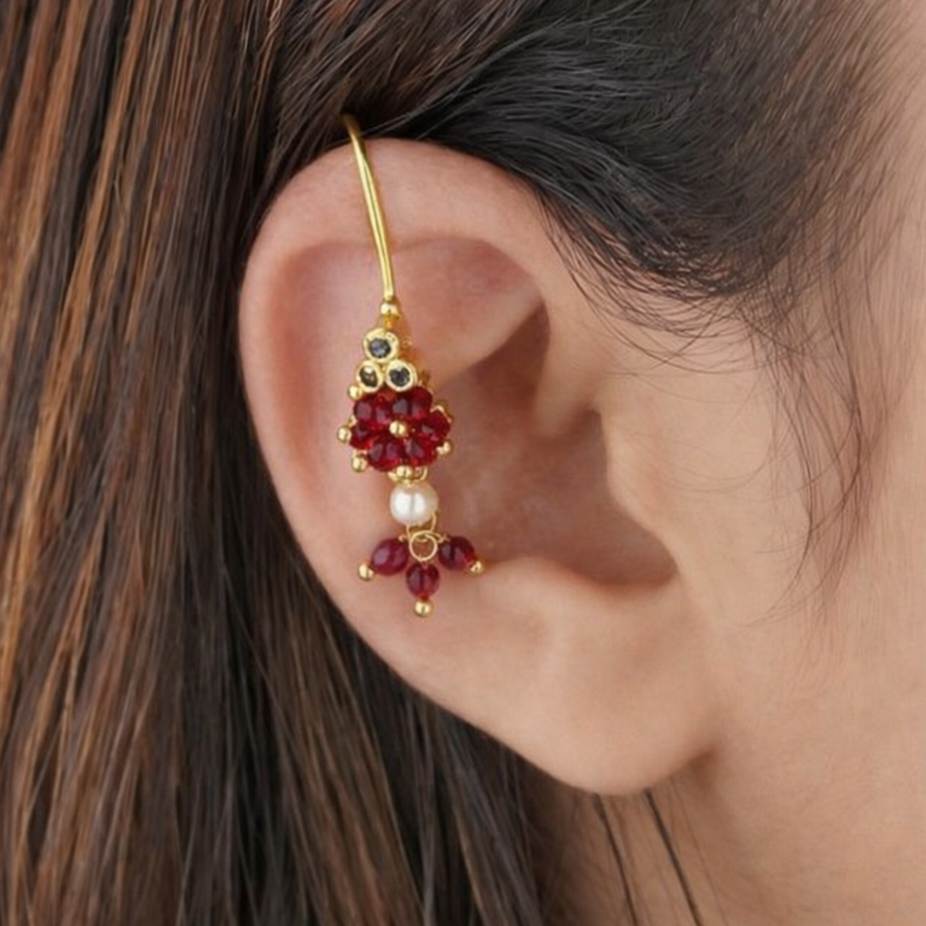 These traditional Bugadi earrings feature a classic cluster of lustrous beads, highlighted by a vibrant gemstone accent at the top. Perfect for festive occasions, this lightweight antique-gold accessory adds an authentic Maharashtrian touch to any ethnic ensemble.