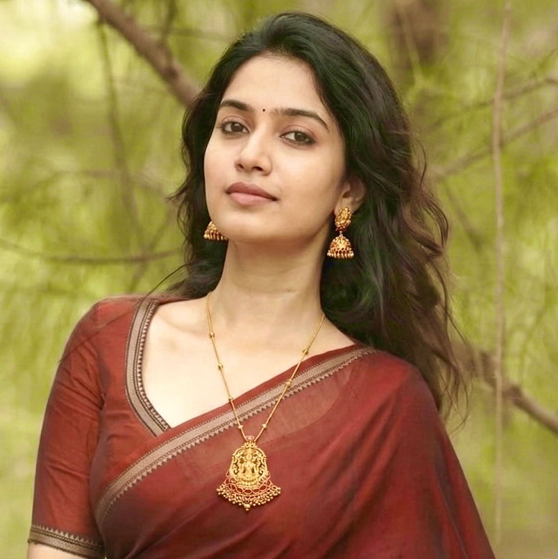 The centerpiece features an intricate motif of Goddess Lakshmi seated on a lotus. It is accented with ruby-red stones along the arch and finished with a cluster of dangling gold beads at the bottom.The set includes matching jhumkas .