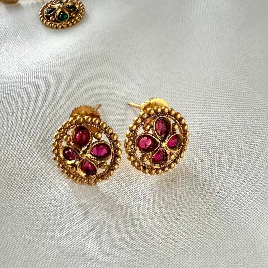 Crafted with a sophisticated antique matte gold finish, the design features five delicate floral motifs, each studded alternatively with ruby and emerald stones in a classic four-petal arrangement. The motifs are gracefully spaced with cylindrical gold accents, offering a lightweight and airy look that is distinct from heavier traditional jewelry.