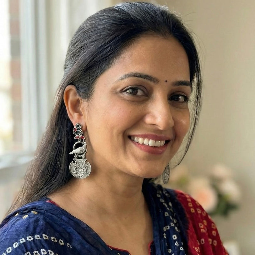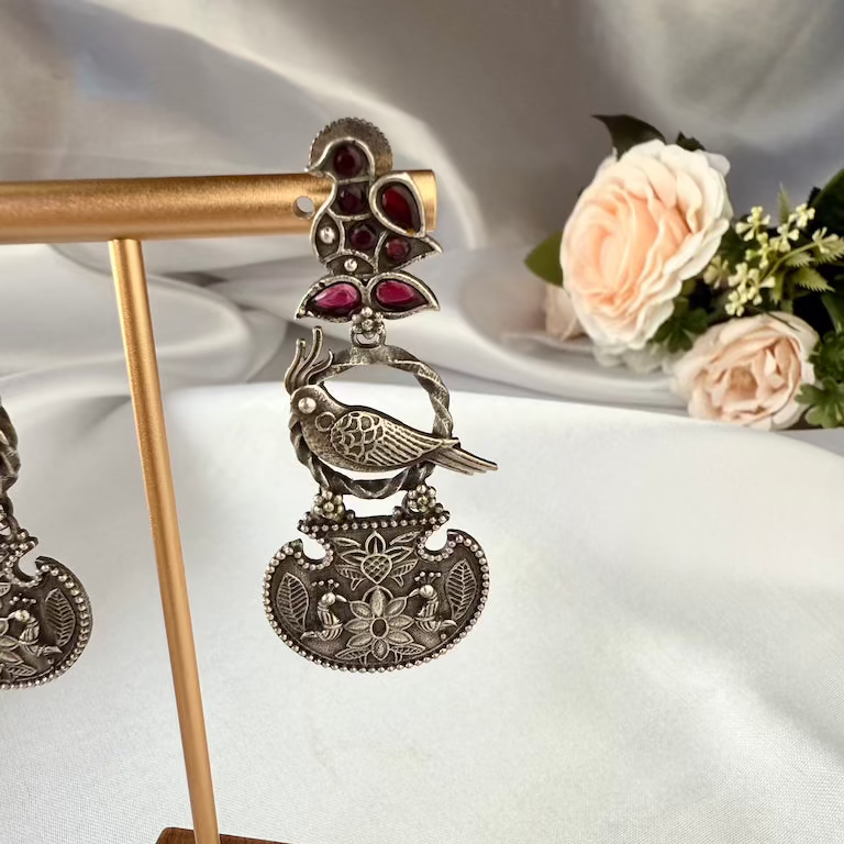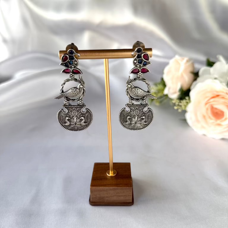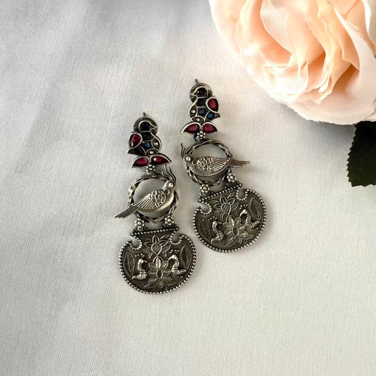 This statement accessory features a unique three-part design, beginning with a gemstone-encrusted bird stud in deep red and blue tones. The center highlights a textured silver parrot perched within an open circle, bridging the gap to an intricately embossed semi-circular drop. Completed with an antique oxidized finish, the bottom tier showcases detailed floral motifs and twin birds for a cohesive, nature-inspired look.