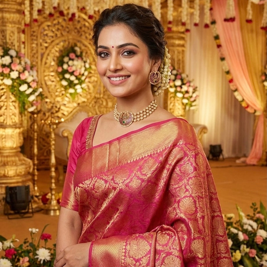 A perfect blend of traditional artistry and classic elegance. This choker has at it's heart a stunning crescent-shaped pendant, intricately studded with deep ruby-red Kemp stones and accented by a central emerald-green gem. The pendant is framed by delicate pearl clusters, giving it a soft, royal finish.