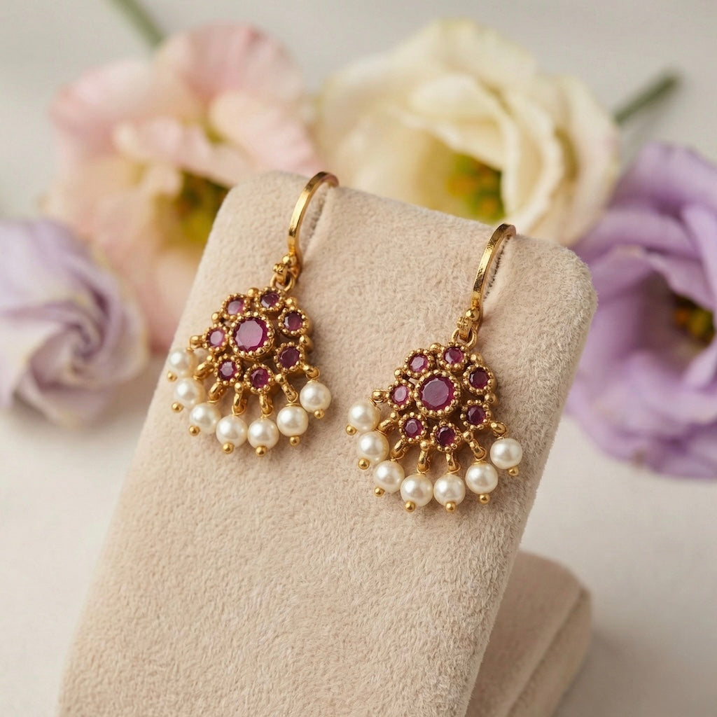 This exquisite set features a sleek, gold-toned flexible chain adorned with delicate floral-inspired charms set with vibrant stones and white pearl drops. The matching drop earrings mirror the necklace’s intricate cluster design, creating a refined and cohesive look perfect for both festive occasions and elegant daily wear.