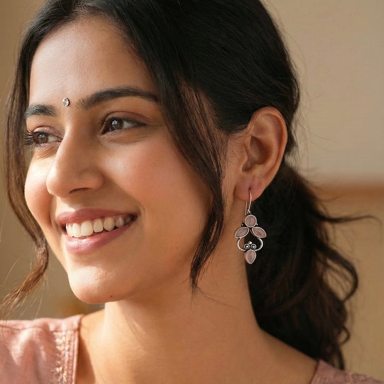 Embrace understated elegance with these charming silver drop earrings. Featuring a soothing palette of pale blush pink, these earrings mimic the organic beauty of a blooming flower.