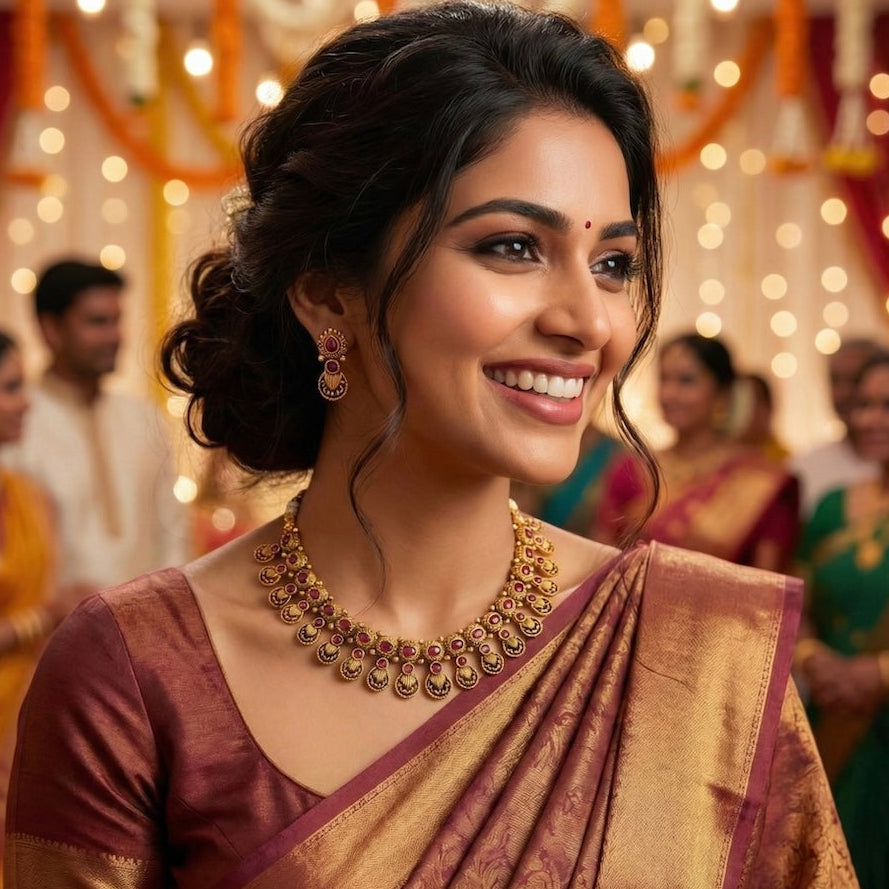 Featuring deep crimson kemp stones set against a matte antique gold finish. Its design is defined by a rhythmic row of textured, petal-like drops that create a rich, heritage aesthetic perfect for traditional occasions.