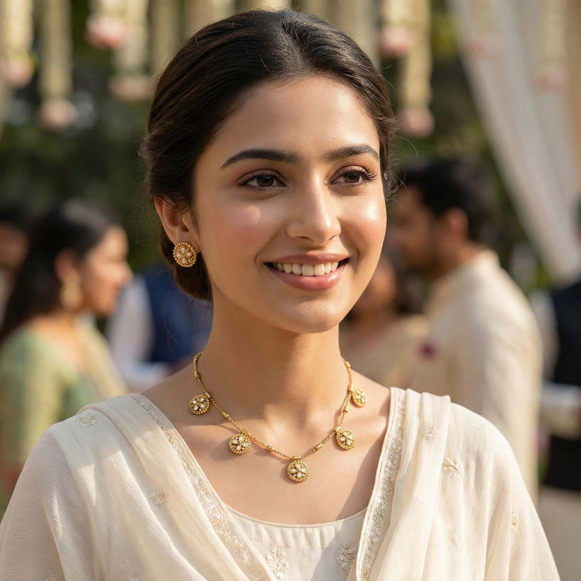 Crafted with a sophisticated antique matte gold finish, the design features five delicate floral motifs, each studded with pearls in a classic four-petal arrangement. The motifs are gracefully spaced with cylindrical gold accents, offering a lightweight and airy look that is distinct from heavier traditional jewellery.